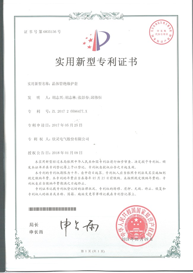 【專利證書】晶體管絕緣護套(實用)