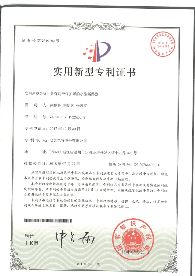 227【專利證書】具有端子保護(hù)罩的小型斷路器(實(shí)用)