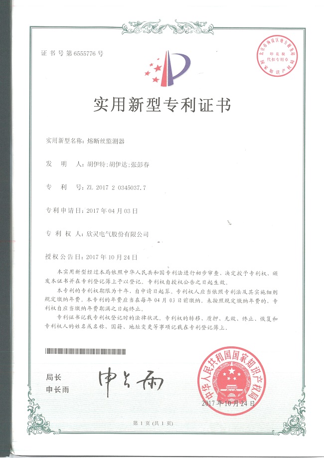 【專利證書】熔斷絲監(jiān)測(cè)器(實(shí)用)